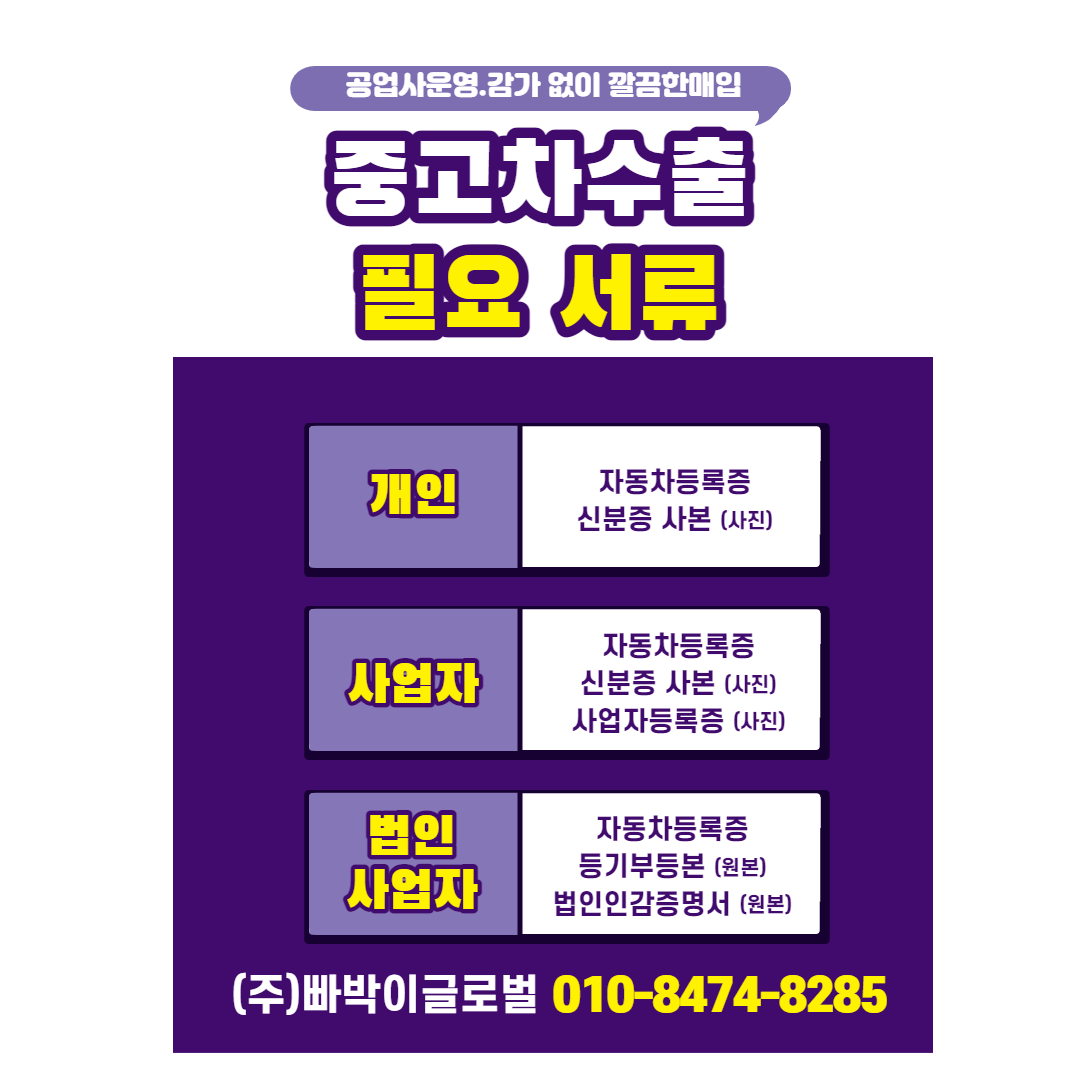 고객님께서 계신곳으로 찾아뵙고 거품없이 시원한 금액으로 감가 일체 없이! 중고차수출 매입처리 도와드리겠습니다!